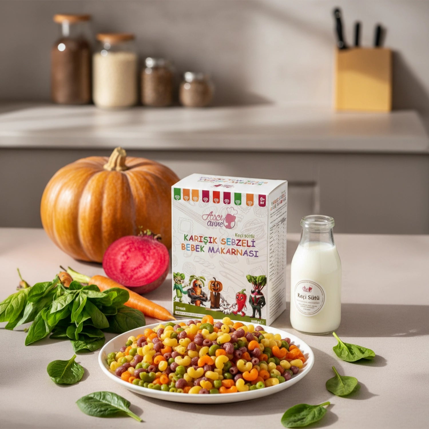 Doğal sebzelerle zenginleştirilmiş bebek makarnası. Havuç, ıspanak, bal kabaklı, kapya biberli ve pancarlı. Katkısız, renkli ve besleyici. 8 ay ve üzeri bebekler için ideal.